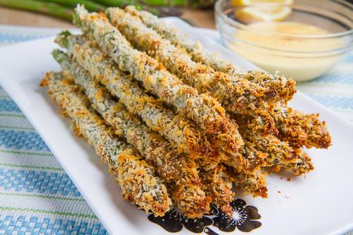 Dredge the asparagus in the flour, dip them in the egg and then into a mixture of the panko breadcrumbs, parmesan, salt and pepper.