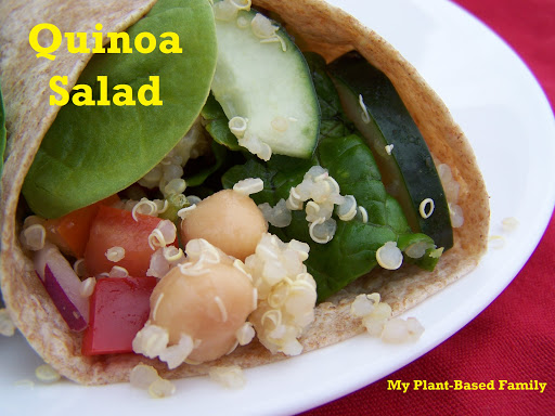 This versatile dish can be served on a green salad for protein filled meal, as a side dish at a potluck, or as part of a wrap. I like to spread hummus on a tortilla, fill it with raw spinach, then add the Quinoa Salad.