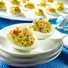 1.Mash egg yolks with avocado in medium bowl. Stir in remaining ingredients, except tortilla chips and egg whites. Generously fill egg whites, then garnish with reserved avocado, tomato and tortilla chips. Garnish, if desired, with additional cilantro.