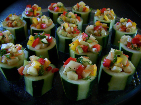 Peel every other 1/2 inch or so of cucumber. Using a small melon-baller or teaspoon, scoop out the center of each cucumber slice, leaving the sides and bottom still intact. Spoon a heaping tablespoon of the chopped veggie/fruit mixture into each cucumber cup. To serve, drizzle with the dressing of your choice. Note: If serving these on a buffet, stir the dressing into the chopped vegetable mixture before stuffing it into the cucumber cups.