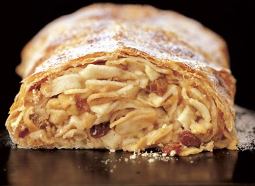 Con un colador ponga azúcar en polvo encima del strudel y sírvalo tibio con la crema tibia en la mesa.