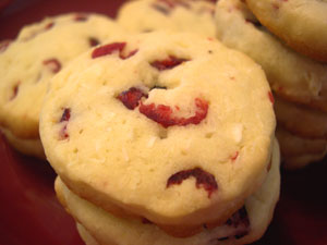7. Slice the logs with a sharp, serrated knife into 1/4-inch or a little thicker slices and place the slices on the cookie sheets. Bake the cookies for 10-11 minutes or until done. Immediately remove them to a wire rack to cool.