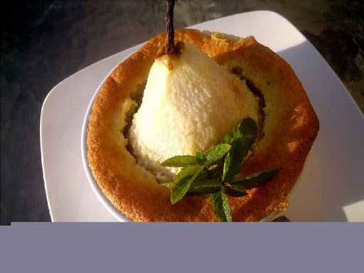 Place a pear in center of each ramekin and press. The batter should cover three quarters of the surface of the bulb. Bake 25-30 minutes until mixture is firm and golden.