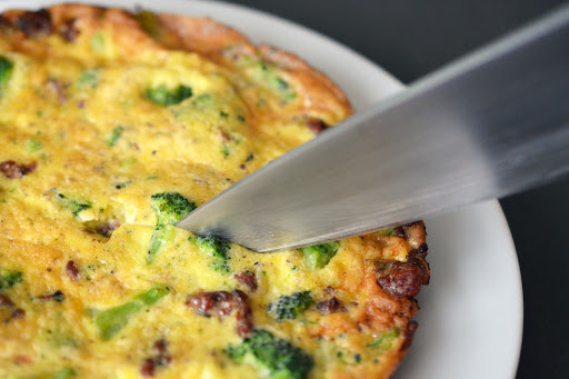 All you do is dice up the meat, chop up some veggies (frozen veggies are perfect), sauté them in an oven-safe skillet, add some eggs and dairy/coconut milk, and pop it all in the oven until it sets.