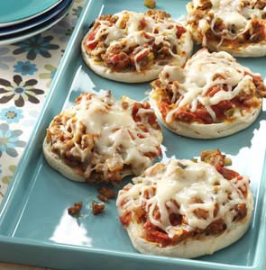 Top each muffin half with 2 tablespoons meat sauce; sprinkle with cheese. Broil until cheese melts and filling is hot. Serve immediately. Yield: 12 servings.