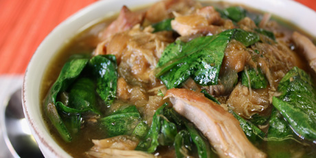 Turning your attention to the onions, toss them with the bay leaf, thyme, salt and pepper. Add half the onion mixture to your slow cooker. Pile in all the browned chicken. Layer on the remaining onions. Pour on the chicken broth and sherry. Cover and cook for 6 hours on high or 8 hours on low. Before serving, pull the bones from the chicken, stir in the spinach. Stir to wilt the spinach, serve and share.