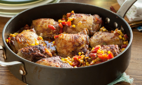 Combine onions, corn, tomato and bell pepper in a 13 x 9-inch pan. Place chicken on top of corn mixture. Cover and bake 15 minutes. Uncover and bake 15 minutes more. Serves 4.