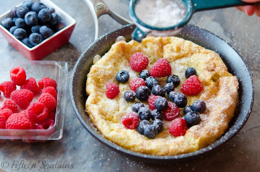 Heat up an ovenproof 8 or 10 inch nonstick skillet on the stove over medium high heat, and add the butter. Let it melt, and once it begins to turn brown, pour in the pancake batter all at once. Immediately place the pan into the oven and bake for 20-25 minutes if using the 8 inch skillet, or 18-20 minutes in the 10 inch skillet. The pancake should be puffed up and golden brown. Serve the pancake cut up into slices, dusted with powdered sugar and garnished with the fresh berries. Enjoy!