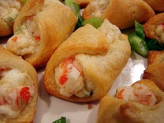 In small bowl, mix cream cheese, mayo, crabmeat, onion, and red pepper. Salt and pepper to taste. Divide crab mixture evenly among the squares, dropping it by spoonfulls that are 1/2 inch from 1 corner of each square. Starting with same corner, fold dough over filling, and tuck end tightly underneath filling; continue rolling to within 1/2 inch of opposite corner. Roll opposite corner of dough over roll; press to seal. Place on cookie sheet. Brush with egg white, if desired.
