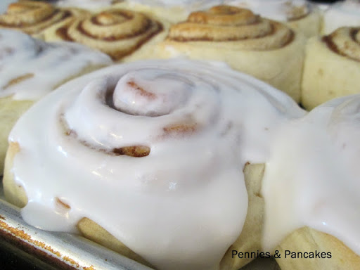 Coat a clean surface with non-stick cooking spray. Roll out the dough into a rectangle approx. 32"x18". Using a spoon or your hand, spread the cinnamon-sugar mixture to cover the dough completely. Starting at one of the 32" sides of the dough rectangle, tightly roll the dough to form a 32" long cylinder. Slide a piece of thread underneath the rolled up dough, 1 inch. Crossing the ends of the thread over the dough, pull both sides of the thread as you would when tightening a knot. The string will cut cleanly through the dough. Place the cut roll onto the greased pan, pinching the end seam into the side of the roll, so that it won't come apart as it rises. Continue the process, evenly spacing 15 rolls on each pan (3X5 per pan). There will be lots of space between each roll. Cover and let rise 45 minutes, or until the sides of the rolls touch each other.