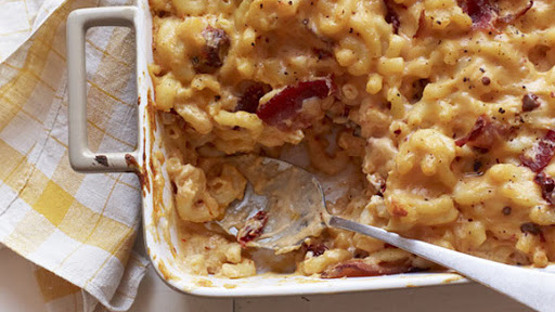 4. Pour sauce over macaroni. Stir in chiles, bacon and remaining cheese. Mix well.