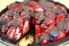 Spread the cream into the chocolate pie crust. (I recommend not putting all of the cream in the crust at first. There is a lot of cream and it will overflow as you stuff in the quart of strawberries.) Then, press the sliced berries into the mixture ALL over it. Find every single available nook & cranny, and shove a berry in it!