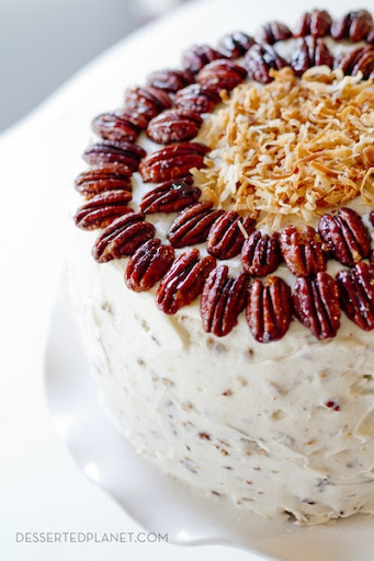 1.Split cake layers in half horizontally. Place a layer on a plate or cake stand and spread with a thin layer of frosting and then marmalade. Top with a cake layer. Spread with another thin layer of frosting and marmalade. Top with third cake layer and spread again with frosting and marmalade. Top with final cake layer and frost sides and top of cake with the remaining pecan cream cheese frosting. Garnish with glazed pecans and toasted coconut. Serve with remaining orange marmalade.