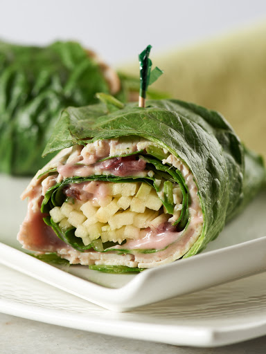 To assemble the wraps, lay the lettuce leaves out flat on a large work surface. Carefully remove 3/4 of the hard center core with a knife. Layer two slices of turkey on top of each lettuce leaf and distribute all of the cranberry mayo on the turkey, spreading evenly. A 1/4 cup of baby spinach gets layered on next, followed by 1/8 of the julienned apple. Roll up each lettuce wrap and secure it closed with a toothpick.