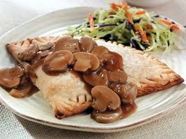 Bake 13 to 18 minutes or until crust is deep golden brown. Meanwhile, in 1-quart saucepan, mix gravy and mushrooms. Cook over medium heat, stirring occasionally, until thoroughly heated. Serve sauce over turnovers.