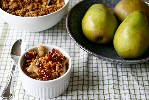 To serve, add a layer of granola to serving dishes. Top with warmed pears and sprinkle additional granola over the top.