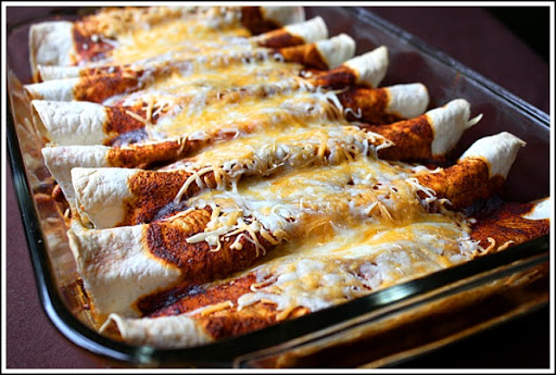 Place 1/4 cup of meat mixture across the centre of each tortilla. Roll up and place seam-side down in lightly greased shallow baking dish.