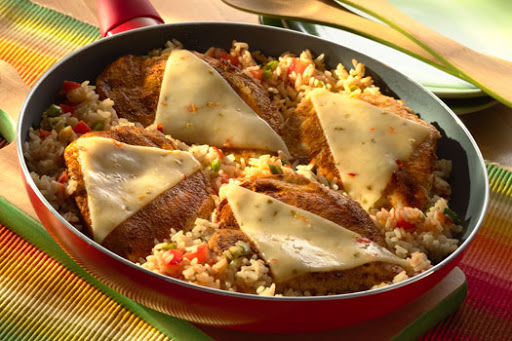 Stir tomato and onions into rice. Place chicken and any juices from plate over rice; top with cheese. Cover; simmer over low heat until liquid is absorbed and cheese has melted, about 4 minutes.