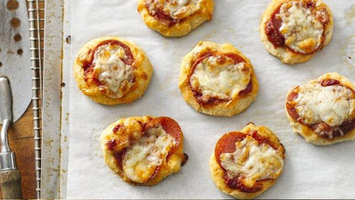2 Separate dough into 10 biscuits. Separate each biscuit into 4 layers; place on greased cookie sheets. Spread each biscuit layer with 1 teaspoon pizza sauce. Top each with 2 pepperoni slices and about 2 teaspoons cheese.