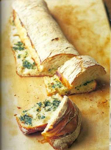 Slice the ciabatta bread in half horizontally, and spread the butter on 1 half. Spread the garlic mixture on the other half of the bread, and put the halves together. Wrap the bread in aluminum foil.