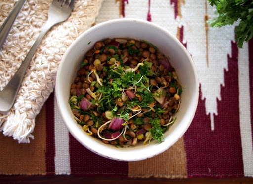 Once the lentils are cooked, this salad comes together quickly. Mint and cilantro complement this dish well, but you could try basil and tarragon instead for a nice change.