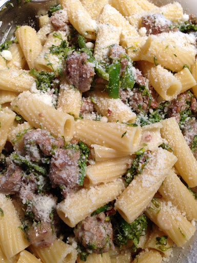 1, Cook Pasta according to package directions. Reserve pasta cooking water Meanwhile , heat olive oil in a large saucepan over medium heat. Add sausage and cook, crumbling it with a spoon, until no trace of pink remains, about 7 minutes. Spoon off and discard any excess fat. Add the garlic and cook for 1 minute. Add the broth and red pepper flakes and bring to a boil. Add the broccolini, cover and cook until tender, about 3 minutes.Stir in butter and parmesan and cook , uncovered, until the sauce thickens slightly about 2 minutes. Add the drained pasta, salt and pepper and 1 cup pasta cooking water and toss to combine. Set aside for a few minutes before serving to allow pasta to absorb some of the flavorful liquid