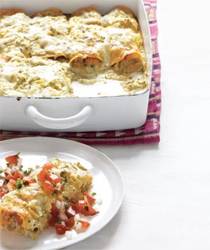 3. Warm the tortillas according to the package directions. Spread 1 cup of the remaining sauce in a 9-by-13-inch baking dish. Roll the chicken mixture in the tortillas and place them in the dish, seam-side down.
