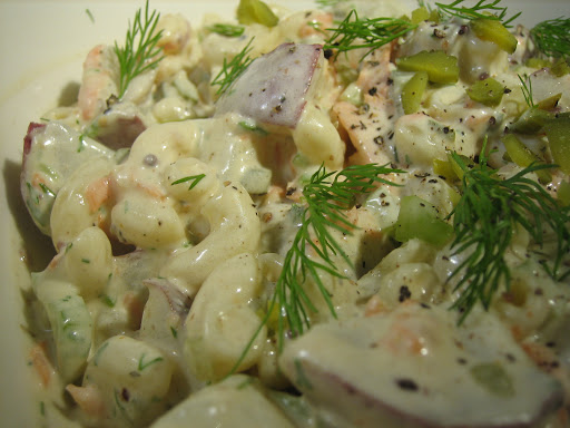 4. Whisk together the mayonnaise, vinegar, curry powder, celery seed, salt, and pepper in a bowl. Combine the cooled potatoes, macaroni, chopped eggs, carrots, peas, and onion in a large bowl. Carefully stir in the dressing; cover and refrigerate overnight.