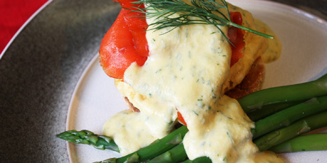 Place two toasted English muffin halves onto each of 4 plates. Add a spoonful of scrambled eggs, layer a slice or two of smoked salmon and then 3 asparagus spears. Ladle Béarnaise sauce over. Serve and share.