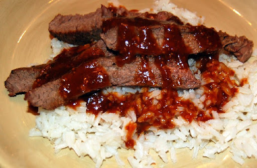 While the steak is standing, heat the olive oil in a small saucepan over medium heat. Add the garlic, and cook for 30 seconds, stirring constantly. Add the broth and the remaining ingredients. Bring to a boil; reduce heat, and simmer for 5 minutes or until thick, stirring with a whisk. Cut steak diagonally across the grain into thin slices, and serve with sauce.