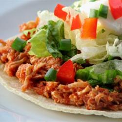 To serve, mound the chicken onto tostada shells, and garnish with a dollop of sour cream.