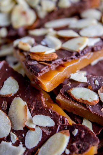 Sprinkle right away with sliced almonds. You can use your hands to gently press the almonds in; whichever ones are not touching melty chocolate are just going to fall right off.