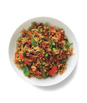Add the rice, peas, snow peas, carrots, hoisin sauce, and vinegar to the turkey mixture and cook until heated through, 2 to 3 minutes.