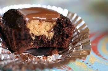 7. Push 1 Reeses in center of each “brownie cupcake” until even with surface of the batter.