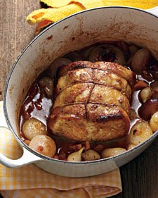 Transfer pork to a plate, tent loosely with foil, and let rest 10 minutes. On stovetop, bring cooking liquid to a boil over medium-high and cook until slightly thickened, 3 minutes. Stir in vinegar. Thinly slice pork and serve with onions, apricots, and sauce.