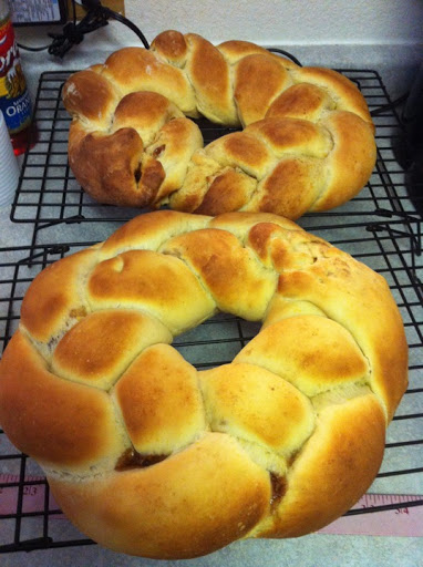 When dough has doubled, punch down and divide in half. On a floured surface, roll half into a rectangle 30 X 15-inches. Brush with half of melted butter and cut into 3 lengthwise strips. Sprinkle half of sugar mixture on strips, leaving a 1-inch lengthwise strip free for sealing. Fold each strip lengthwise toward the center, sealing the seam. You will now have 3, 30-inch strips with sugar mixture enclosed in each. Braid the 3 strips and make a circle by joining the ends. Repeat with other half of dough.