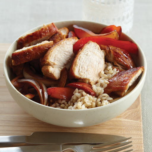 Add the onions and bell peppers to the skillet and cook for 3 minutes, stirring and scraping up the brown bits from the bottom of the pan. Reduce the heat to moderate, cover and cook for 5 minutes, stirring occasionally. Return the chicken to the skillet, nestling it into the onions and peppers. Cover and cook for 5 minutes longer. Uncover and add the honey. Cook over high heat, stirring and turning the chicken breasts, until the honey caramelizes, 1 to 2 minutes. Season with salt and pepper and serve right away.