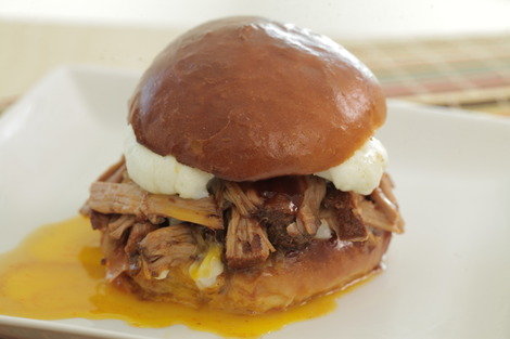 Pile the pork on one half of the bun, top with poached egg, add a little barbecue sauce to the other half of the bun, and place it on top of the egg to close the sandwich.