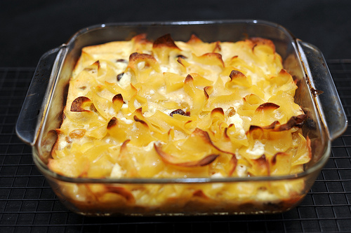 Crumble together 8 teaspoons of sugar, 8 tablespoons of melted butter, and Graham crackers until they make a crumble or sand-like texture. Add topping onto the noodles. Bake at 350°F for 1 hour. Let cool slightly before serving.