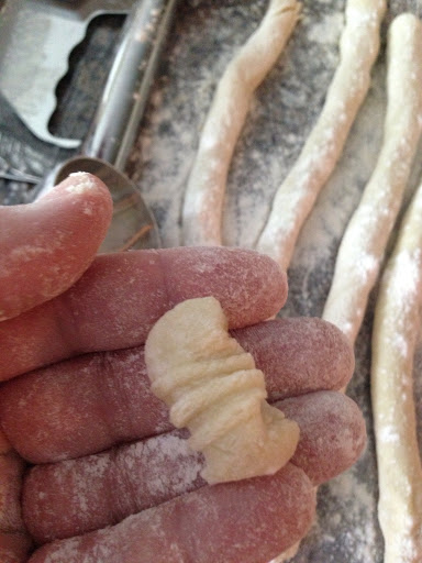 Place egg and salt in the center of the well and using a fork, stir into flour and potatoes, just like making normal pasta. Once the egg is mixed in, bring dough together, kneading gently until a ball is formed. Knead gently another 4 minutes until ball is dry to the touch. Roll baseball sized ball of dough into 3/4 inch diameter dowels and cut dowels into 1 inch long pieces.