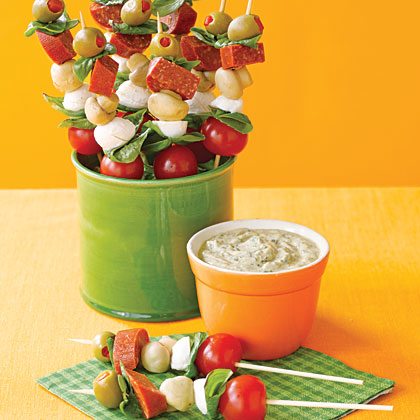 Make skewers: Thread ingredients one by one onto skewers in this order: cherry tomato, folded basil leaf, half a mozzarella ball, mushroom, pepperoni, basil, olive. Serve skewers with dip.