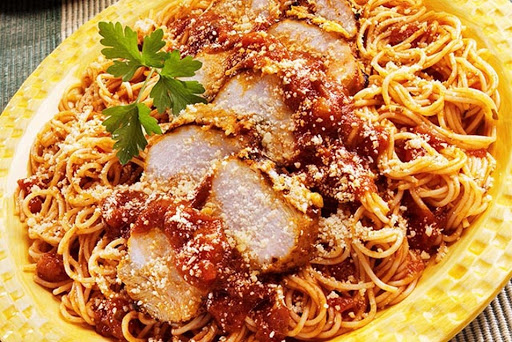 Saucy spaghetti topped with Parmesan is always welcome at the table. Especially when it includes crispy but tender baked chicken breasts.