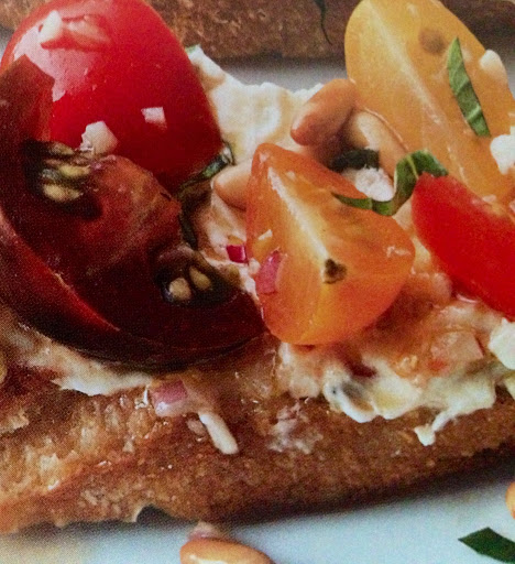 7. Assemble the crostini, spread each slice of bread with a generous amount of cheese mixture. With a slotted spoon, place the tomatoes on top. Put the crostini on plates and scatter with pine nuts. Sprinkle with basil and serve immediately.