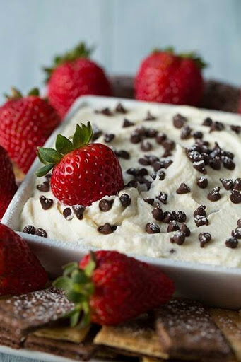 Serve with graham crackers, or chocolate grahams, you can also buy mini cannoli shells & dip like a chip, or fresh strawberries as well.