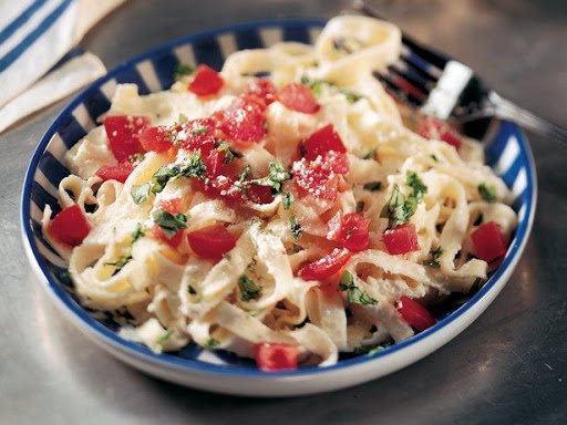 3 Top fettuccine with tomato, basil and remaining Parmesan cheese.