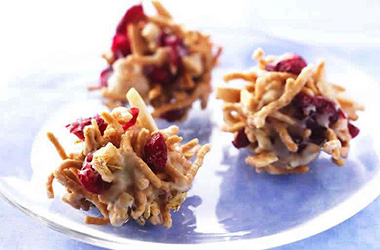 Combine remaining ingredients in large bowl. Pour cream mixture over sweetened dried cranberry mixture. Stir until mixed and coated. Drop by heaping tablespoonfuls onto waxed paper. Let stand until completely set. Store loosely covered.