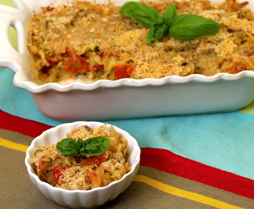 Preheat oven to 350 degrees F. Heat the squash whole in the microwave for about 5 minutes. Use pot holders to remove the squash, cut in half and scoop out the seeds and strings (the strings are darker yellow and thin). Place one half cut side down on a microwave safe dish (no water needed) and heat for 3-5 minutes or until the spaghetti strings can be removed easily with a fork. Repeat with the other half. While each side is cooking prep the zucchini, onion and garlic and cook the onion until soft, then add the garlic and cook for another minutes. Fork out the strands from the spaghetti squash into a bowl and add the shredded zucchini, tomatoes, red onion, garlic, basil and salt and pepper and stir to combine. Add the parmesan cheese and gently stir. Place in a 9×9 baking dish and sprinkle the top evenly with breadcrumbs and a little parmesan. Cook for 25 minutes. Serves 4 with leftovers.