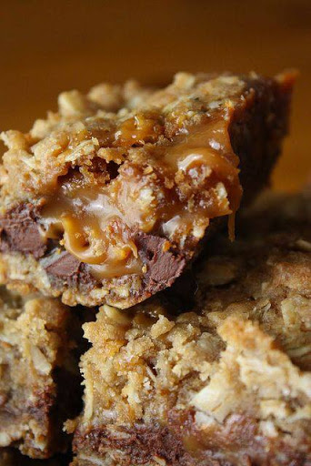 Combine caramels and cream in a small saucepan over low heat. Stir until completely smooth; set aside. In a separate bowl, combine melted butter, brown sugar, flour, oats, and baking soda. Pat half of the oatmeal mixture into the bottom of an 8x8" pan. Bake at 350 degrees for 10 minutes. Remove pan from oven and sprinkle chocolate chips over crust. Pour caramel mixture over chocolate chips. Crumble remaining oatmeal mixture over caramel. Return to oven and bake an additional 15-20 minutes, until the edges are lightly browned. Remove from oven and cool completely before cutting.