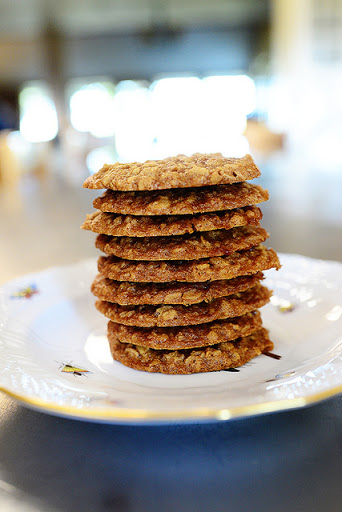 Mix together the flour, salt, and baking soda in a medium sized bowl. Add it into the creamed mixture in 2 to 3 batches, mixing it until just combined. Mix in the oats until just combined.