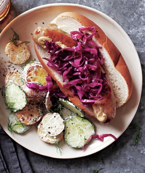 The refreshing cucumber potato salad is the perfect complement to juicy bratwursts and sautéed cabbage.